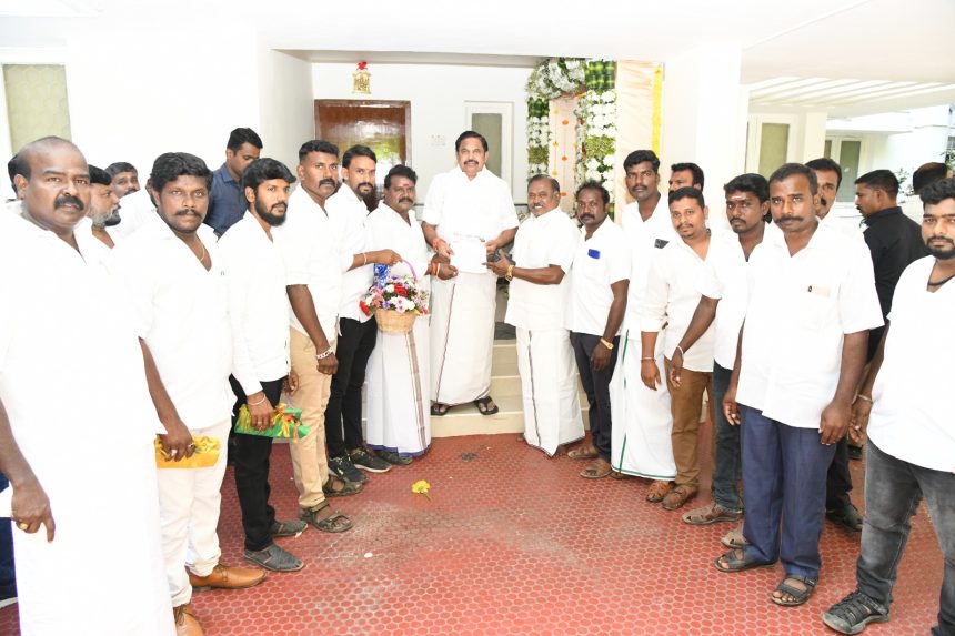 தூத்துக்குடி அதிமுக பொதுச் செயலாளரும் முன்னாள் முதலமைச்சரும் எதிா்கட்சி தலைவருமான எடப்பாடி பழனிச்சாமியை சென்னை பசுமை வழி சாலையில் உள்ள அவரது இல்லத்தில் நாடார் பாதுகாப்பு பேரவை தலைவர் இ.எம்.சீனிவாசன் தலைமையில் மாநில வா்த்தக அணி செலயாளரும் முன்னாள் அமைச்சர் சித…