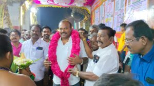 இங்கு அமைக்கப்பட்டுள்ள பழைய குடிநீர் குழாய்களில் ஒரு குறைபாடு என்றால் அதை களைவதற்கு சற்று சிரமமாக இருந்தது மக்களுக்கு சுகாதாரமான குடிநீர் வழங்க வேண்டும் என்பதற்காக பழைய பைப்புகள் அகற்றப்பட்டு புதிய கருப்பு பைப் லைன் கொடுக்கப்பட்டுள்ளது. இனி எல்லோருக்கும் தண்ணீர் தட்டுபாடின்றி முறையாக கிடைக்கும் எதிர்கால தலைமுறையினா் நலன் முக்கியம் என்பதை கருத்தில் கொண்டு பணியாற்றி வருகிறோம் இதற்கு அனைவரும் முழுமையாக ஓத்துழைக்க வேண்டும். அந்த பணி முடிந்ததும் எல்லா பகுதிகளுக்கும் புதிய தாா்சாலை பேவா் பிளாக் சாலைகள் அமைப்பதற்கு ஒப்பந்தங்கள் போடப்பட்டுள்ளன. அந்த பணிகளை சிறப்பான முறையில் செய்து தருவேன் என்று தொிவித்துக்கொள்கிறேன். என்று பேசினாா் முன்னதாக சாமி தாிசனம் செய்தாா்.