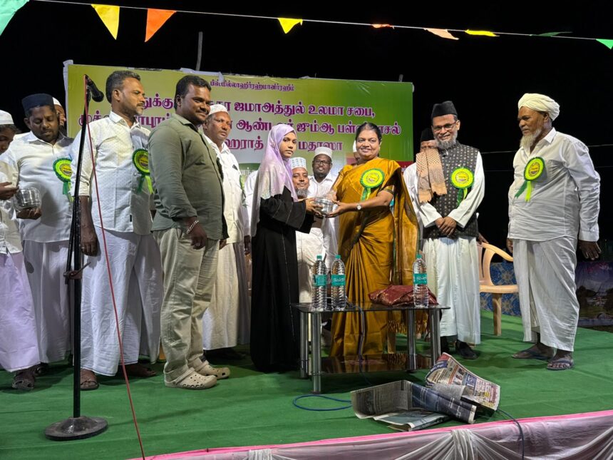 இஸ்லாமிய மாதங்களில் ரபீஉல் அவ்வல் மாதம் மூன்றாவது மாதமாகும், இந்த மாதத்தின் 12 ஆம் நாள் நபிகள் நாயகத்தின் பிறந்த நாளாகும். முகமது நபிகள் பிறந்ததை நினைவுகூரும் வகையில் வாழ்க்கையைப் போற்றியும், அவர்களின் போதனைகளை நினைவு கூர்ந்தும் இஸ்லாமியர்கள் கொண்டாடுகின்றனர். அதன் அடிப்படையில் தூத்துக்குடி மாநகர ஜமாத்துல் உலமா சபை மற்றும் முகைதீன் ஜும்மா பள்ளிவாசல் முத்தையாபுரம் சார்பில் மக்தப் மாணவர்களின் சிறப்பு நிகழ்ச்சி நடைபெற்றது இந்நிகழ்வில் சிறப்பு அழைப்பாளராக சமூக நலன் மற்றும் மகளிர் உரிமைத்துறை அமைச்சர் கீதாஜீவன், கலந்து கொண்டு மாணவ மாணவிகளுக்கு பரிசளித்து சிறப்புரை ஆற்றினார். நிகழ்ச்சியில் தூத்துக்குடி மாநகர ஜமாத் உலமா சபை தலைவர் இம்தாதுல்லாஹ், மாவட்ட தலைவர் ஷேக் முஹம்மது, செயலாளர் சம்சுதீன், முத்தையாபுரம் ஜும்ஆ பள்ளிவாசல் தலைவர் செய்யது மரைக்காயர், செயலாளர் முஹம்மது, பொருளாளர் அப்துல் மஜித், துணை செயலாளர் சம்சுகனி, நிர்வாககுழு உறுப்பினர் செய்யது சிராஜுதீன் , அப்பாஸ்,கமால்தீன், சிக்கந்தர், சம்ஜத் உசேன் உள்ளிட்ட நிர்வாகிகள் மற்றும் பொது மக்கள் பலர் கலந்து கொண்டனர்….
