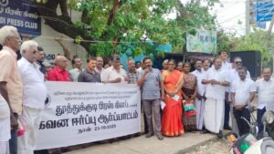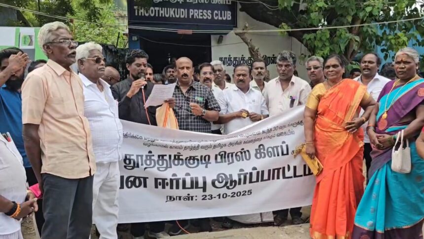 தமிழகத்தின் பல்வேறு மாவட்டங்களில் பத்திரிகை மற்றும் ஊடகத்துறையினருக்கு தமிழக அரசின் சலுகை விலை வீட்டு மனை நான்கு கட்டங்களாக வழங்கப்பட்டு உள்ள நிலையில், தூத்துக்குடி சார்ந்த பத்திரிகை மற்றும் ஊடக துறையினருக்கு கடந்த 30 வருடத்திற்கு மேலாக தொடர்ந்து அரசின் கவனத்தை ஈர்க்கும் வகையில் பல்வேறு கட்ட மனுக்களை முதலமைச்சர் முதல், நாடாளுமன்ற உறுப்பினர் கனிமொழி மற்றும் அமைச்சர்கள் கீதாஜீவன், அனிதா ராதாகிருஷ்ணன், சாமிநாதன் உள்ளிட்ட பலரிடம் மனு அளித்தும் மாவட்ட நிர்வாகம் இதுவரை நடவடிக்கை எடுக்காததை கண்டித்து, அரசின் கவனத்தை ஈர்க்கும் வகையில் நடைபெற்ற ஆர்ப்பாட்டத்தில் பத்திரிகையாளர்கள் கருப்பு உடை அணிந்தும், கருப்பு பேட்ஜ் அணிந்தும் கலந்து கொண்டு சலுகை விலை வீட்டுமனை விரைந்து வழங்கிட வலியுறுத்தி கண்டன கோஷங்களை எழுப்பி ஆர்ப்பாட்டத்தில் ஈடுபட்டனர்.