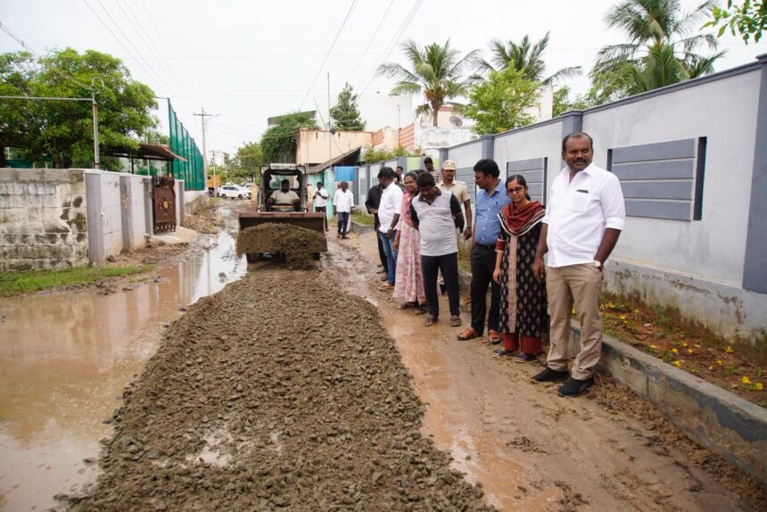 இந்த நிலையில் பிஎன்டி காலனி பகுதியில் பாதாள சாக்கடை பணிகள் நடைபெற்ற காரணத்தினால் அப்பகுதியில் மழை நீர் தேங்கியிருந்தது. அந்தப் பகுதியில் மழை நீர் முழுவதும் தற்போது அப்புறப்படுத்தப்பட்டு விட்டது. இதனை அடுத்து பொதுமக்கள் பயன்படுத்தும் சாலைகள் குண்டும் குழியுமாக காணப்பட்டது. இதனையடுத்து தற்காலிகமாக சாலையை சீரமைத்து தருமாறு பொதுமக்கள் மாநகராட்சி மேயர் ஜெகன் பெரியசாமிக்கு கோரிக்கை விடுத்தனர். உடனடியாக மாநகராட்சி மேயர் ஜெகன் பெரியசாமி அதற்கான நடவடிக்கையை மேற்கொண்டார். அதன் அடிப்படையில் பிஎன்டி காலனி 12வது தெருவில் பாதாள சாக்கடைக்கு தோண்டப்பட்ட பள்ளம் மூடப்பட்டு தற்காலிகமாக சாலை அமைக்கும் பணி துவக்கப்பட்டது. இந்த பணிகளை மாநகராட்சி மேயர் ஜெகன் பெரியசாமி, மாநகராட்சி ஆணையர் ப்ரியங்கா ஆகியோர் நேரில் சென்று நடைபெறும் பணிகளை பார்வையிட்டனர்.
