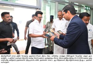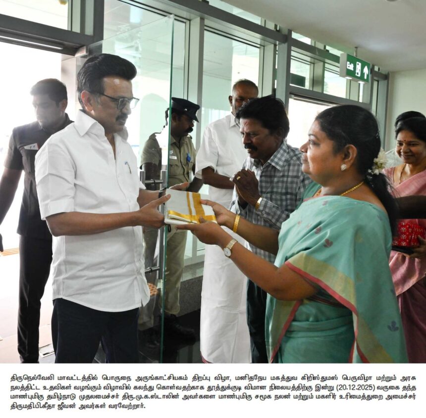 தமிழக முதலமைச்சர் மு.க.ஸ்டாலின் திருநெல்வேலி மாவட்டத்தில் நடைபெறும் பல்வேறு நிகழ்ச்சிகளில் கலந்து கொள்வதற்காக சென்னையிலிருந்து தனி விமானம் மூலம் வாகைக்குளம் வந்த அவருக்கு தூத்துக்குடி நாடாளுமன்ற உறுப்பினர் கனிமொழி கருணாநிதி, வடக்கு மாவட்ட திமுக செயலாளரும் சமூக நலன் மற்றும் மகளிர் உரிமைத் துறை அமைச்சர் கீதாஜீவன், தெற்கு மாவட்ட திமுக செயலாளரும், மீன்வளம் மீனவர் நலன் மற்றும் கால்நடை பராமரிப்புத்துறை அமைச்சர் அனிதா ராதாகிருஷ்ணன், மாநகராட்சி மேயர் ஜெகன் பெரியசாமி ஆகியோர் தலைமையில் உற்சாக வரவேற்பு அளித்தனர்.