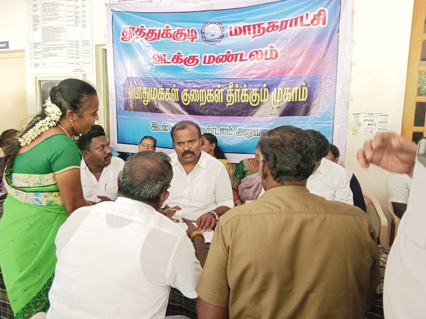 தூத்துக்குடி தமிழக முதலமைச்சர் உத்தரவிற்கிணங்க மாநகராட்சி சார்பில் ஒவ்வொரு வாரமும் மண்டல அலுவலகத்தில் குறைதீர்க்கும் முகாம் நடைபெற்று வருகிறது. ஸ்டேட் பாங்க் காலணியில் உள்ள வடக்கு மண்டல அலுவலகத்தில் நடைபெற்ற குறைதீர்க்கும் முகாமிற்கு மேயர் ஜெகன் பெரியசாமி தலைமை வகித்தார். துணை ஆணையா் சரவணக்குமாா், மண்டலத்தலைவர் நிர்மல்ராஜ், ஆகியோர் முன்னிலை வகித்தனர்.