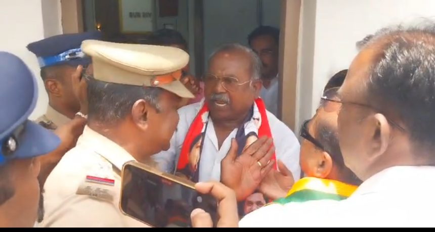 இந் நிலையில் தேர்தல் நடத்தும் அலுவலர் அறையின் வெளியே பாரதிய ஜனதா கட்சியை சேர்ந்த விவேகம் ரமேஷ் மற்றும் இரண்டு பேர் உள்ளே செல்ல முயன்றனர் அப்போது அங்கு பாதுகாப்பு பணியில் இருந்த காவல்துறையினர் இருவரையும் உள்ளே செல்ல விட முடியாது சரியான ஆட்கள் உள்ளே சென்று விட்டார்கள் கூடுதலாக உள்ேள அனுமதிக்க முடியாது என்று காவல்துறையினர் கூறிவிட்டனர். அப்போது வெளியே நின்ற விவேகம் ரமேஷ் வேட்பாளர் செல்லப்பாண்டியனை கூப்பிட்டார் உடனடியாக வேட்பாளர் செல்லப்பாண்டியன் வெளியே வந்து பாதுகாப்பு பணியில் இருந்த காவல்துறை அதிகாரிகளிடம் வாக்குவாதத்தில் ஈடுபட்டார் என்னை வேட்பு மனுத்தாக்கல் செய்ய விடாமல் தடுக்கிறீர்களா ஏன் உள்ளே விட மறுக்கிறீர்கள் என்று வாக்குவாதத்தில் ஈடுபட்டார்.